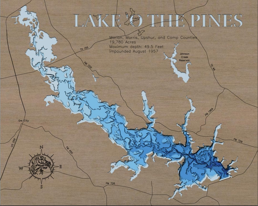 Lake ‘O the Pines, TX 3D Wooden Map | Framed Topographic Wood Chart